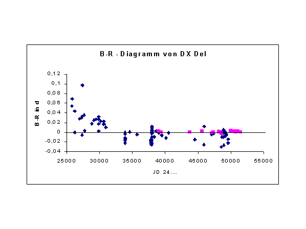 Aber das (B-R)-Diagramm von DX Del ist ausgesprochen ungewöhnlich (siehe Abb.1). Neben einem klassischen Periodensprung sind immer wieder zeitweise