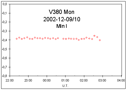 RC-Teleskop 320 mm Beobachtung vom 9./10. Dezember 2002 zeigt nur konstantes Licht dieses wenig beobachteten Sterns. Es existieren nur wenige ältere Plattenschwächungen und einige Fotominima bis 1955. Um das Minimum "einzufangen" sind in den Ephemeriden weitere Beobachtungszeitpunkte um jeweils + oder - 0,30 d versetzt enthalten. Diese sind hinter dem Sternnamen mit einem + oder - gekennzeichnet. Wolfgang Moschner - 25.6.2004